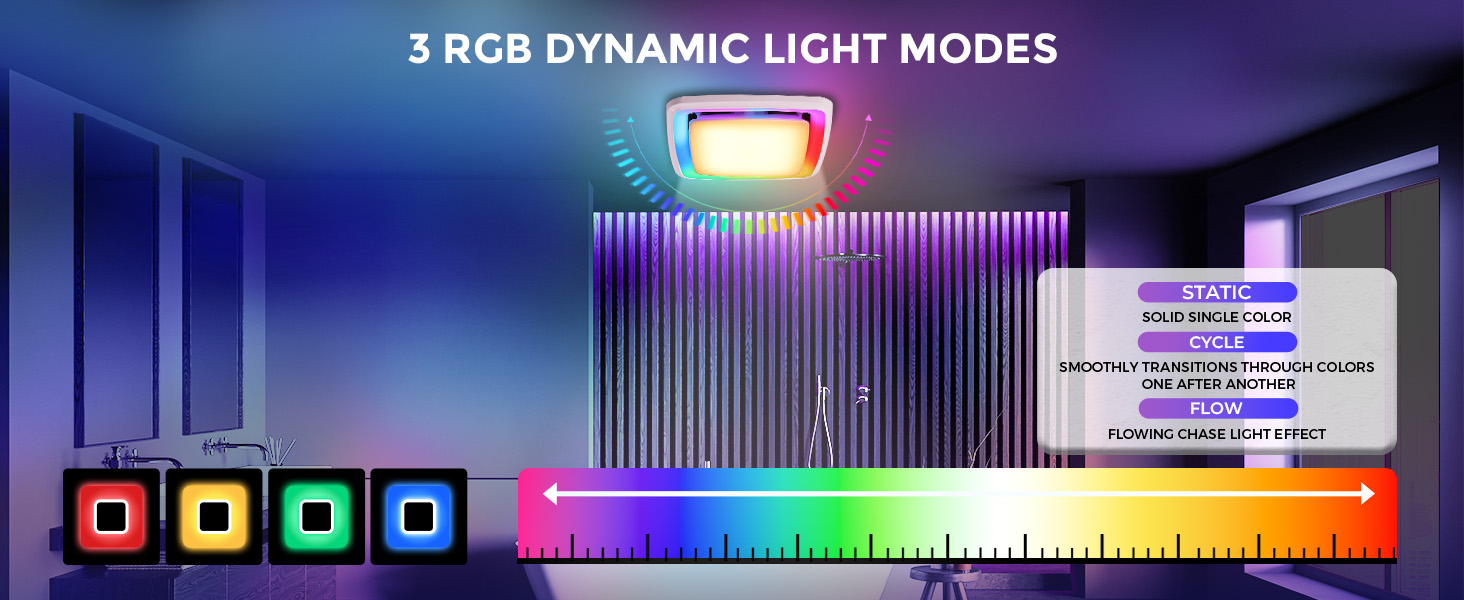 RGB LED LIGHT:The black bathroom ventilation fan is equipped with RGB LED light and 3 dynamic lighting modes, enhancing a relaxing atmosphere during your shower. Static mode displays fixed color: red, yellow, green or blue. Cycle mode smoothly transitions through the colors one after another. Flow mode creates a multi-color flowing chase lighting effect. You can easily switch between the modes to relax while bathing