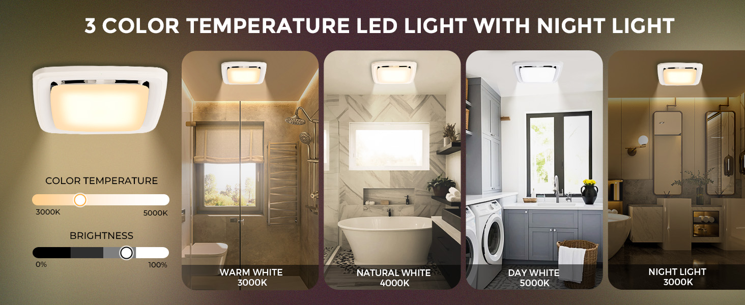 PREMIUM PERFORMANCE: The bathroom fan light combo features dimmable LED light with 3 color temperature settings (3000K/4000K/5500K). It also comes equipped with a 3000K nightlight, helping you navigate safely in the dark and avoid accidental bumps