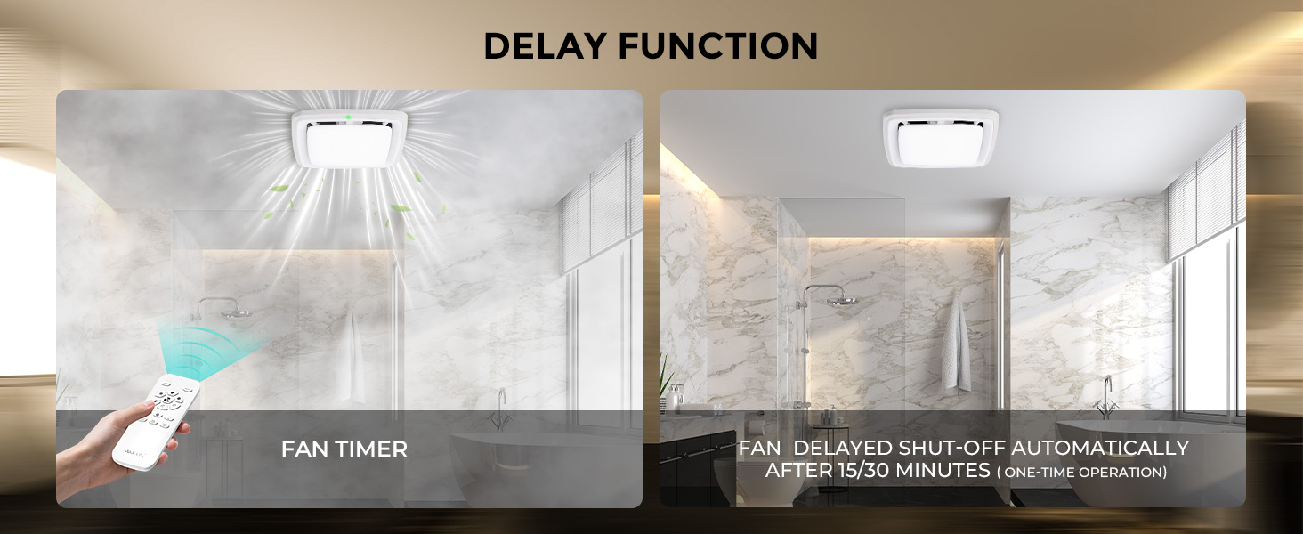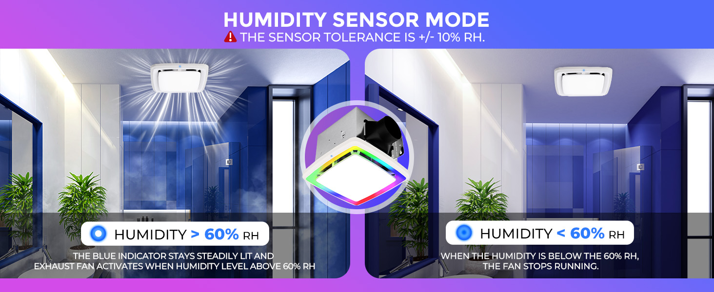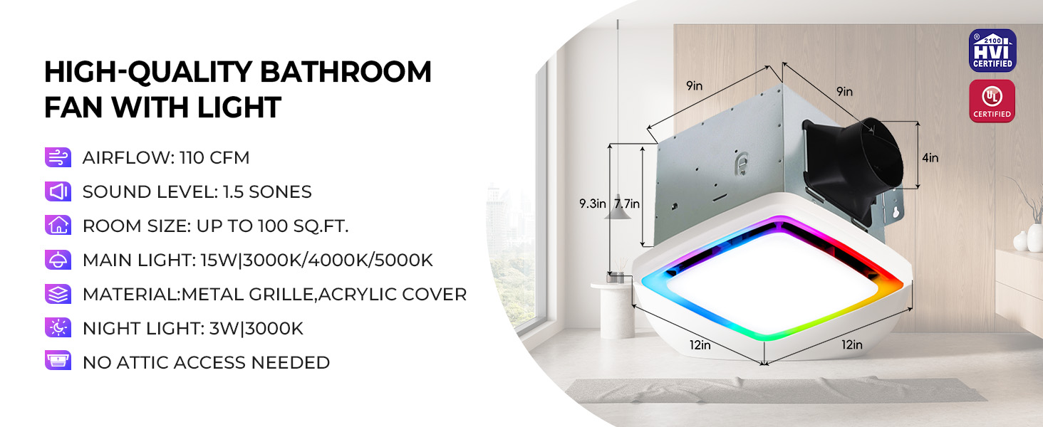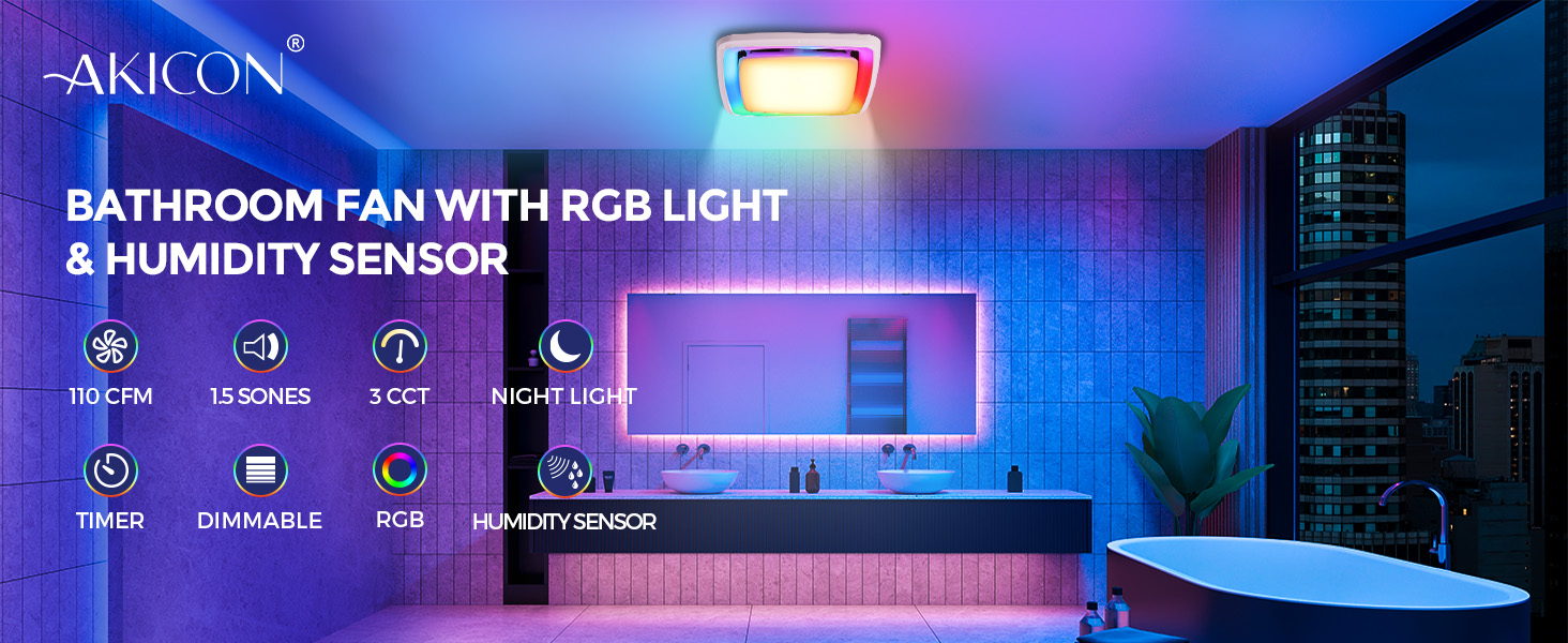 Akicon Bath fan with shower light operates at 110 CFM with ultra-quiet 1.5 sones, effectively eliminating moisture and odors for bathroom comfort. It features a built-in humidity sensor that automatically activates the fan when humidity exceeds preset levels and turns it off once humidity drops below the set point. The RGB lighting offers three dynamic light modes: static, cycle and flow. The main light provides 3CCT dimmable light, complemented by a night light and a 15/30 min delay-off timer. Is ideal for bathrooms, basements, laundry rooms and similar spaces