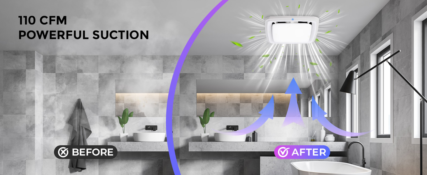 ULTRA-QUIET AND POWERFUL SUCTION: Exhaust fan with LED light delivers 110 CFM airflow, effectively eliminating moisture and odors in spaces up to 110 sq.ft. With noise levels as low as 1.5 sones during operation, it runs quietly without interfering with listening to music or conversation, making it ideal for home use